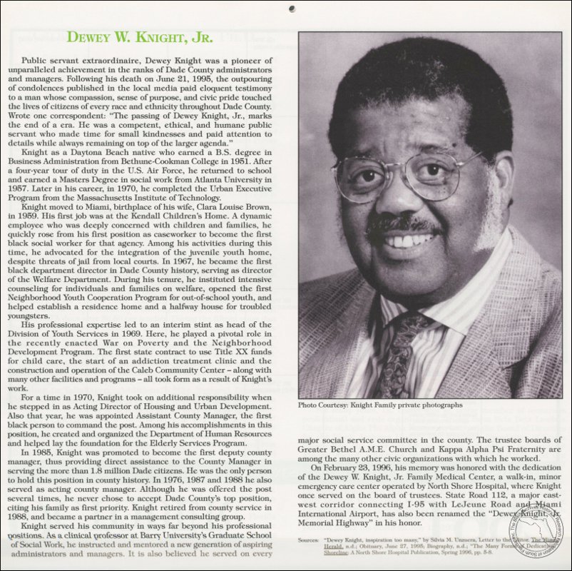 Public servant extraordinaire, Dewey Knight was a pioneer of unparalleled achievement in the ranks of Dade County administrators and managers. Following his death on June 21, 1995, the outpouring of condolences published in the local media paid eloquent testimony to a man whose compassion, sense of purpose, and civic pride touched the lives of citizens of every race and ethnicity throughout Dade County. Wrote one correspondent: “The passing of Dewey Knight, Jr., marks the end of a era. He was a competent, ethical, and humane public servant who made time for small kindnesses and paid attention to details while always remaining on top of the larger agenda.”