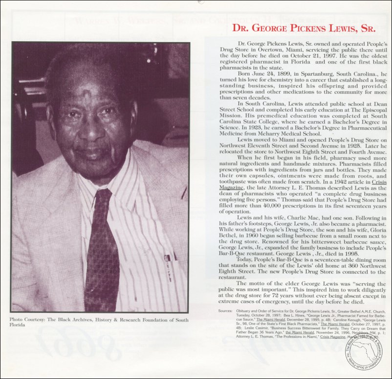 Lewis, Dr. George Pickens, Sr. AT&T Miami-Dade County African-American History Calendar, 1998/1999.