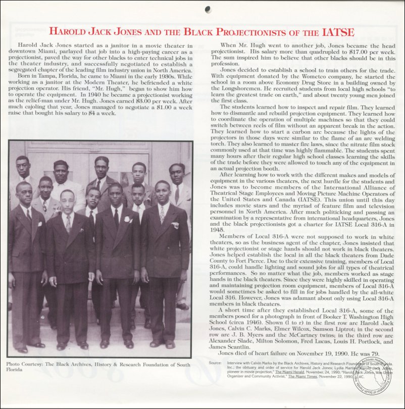 Jones, Harold Jack, and the Black Projectionists of the IATSE. AT&T Miami-Dade County African-American History Calendar, 1998/1999. | The Black Archives History & Research Foundation of South FL, Inc.