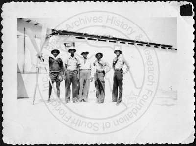 L to R: Frederick Allen, Brockington, Bill Allen, Newman Harrison, Daniel J. Johnson. Virginia Key Beach, Miami, Florida. Unidentified photographer. Dan Johnson Photograph Collection.