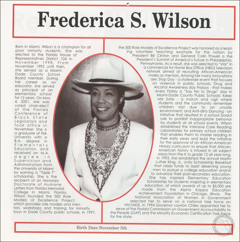 Wilson, Frederica S. AT&T Miami-Dade County African-American History Calendar, 2001/2002.