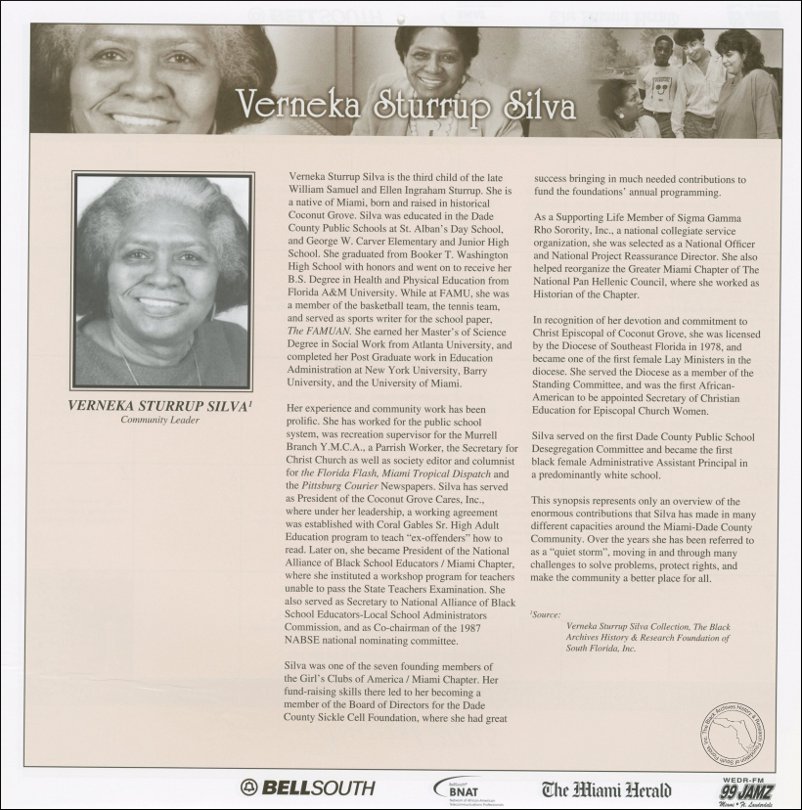 Verneka Sturrup Silva is the third child of the late William Samuel and Ellen Ingraham Sturrup. She is a native of Miami, born and raised in historical Coconut Grove. Silva was educated in the Dade County Public Schools at St. Alban’s Day School, and George W. Carver Elementary and Junior High School. She graduated from Booker T. Washington High School with honors and went on to receive her B.S. Degree in Health and Physical Education from Florida A&M University. While at FAMU, she was a member of the basketball team, the tennis team, and served as sports writer for the school paper, The FAMUAN. She earned her Master’s of Science Degree in Social Work from Atlanta University, and completed her Post Graduate work in Education Administration at New York University, Barry University, and the University of Miami.