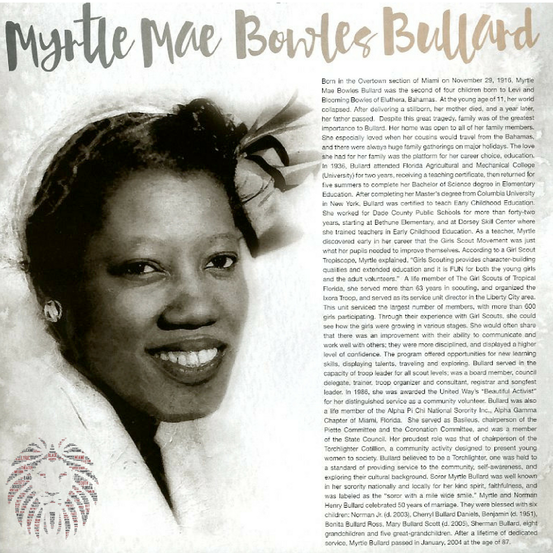 Born in the Overtown section of Miami on November 29, 1916, Myrtle Mae Bowles Bullard was the second of four children born to Levi and Blooming Bowles of Eluthera, Bahamas. At the young age of 11, her world collapsed. After delivering a stillborn, her mother died, and a year later, her father passed. Despite this great tragedy, family was of the greatest importance to Bullard. Her home was open to all of her family members. She especially loved when her cousins would travel from the Bahamas, and there were always huge family gatherings on major holidays. The love she had for her family was the platform for her career choice, education. fin 1936, Bullard attended Florida Agricultural and Mechanical College (University) for two years, receiving a teaching certificate, then returned for five summers to complete her Bachelor of Science degree in Elementary Education.