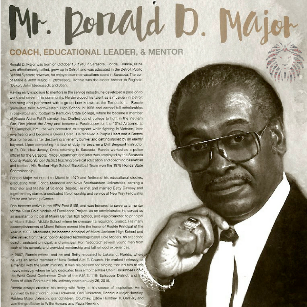 Ronald D. Major was born on October 16,1940 in Sarasota, Florida. Ronnie, as he was affectionately called, grew up in Detroit and was educated in the Detroit Public School System; however, he enjoyed summer vacations spent in Sarasota. The son of Marie & John Major, III (deceased), Ronnie was the eldest brother to Reginald "Duke", John (deceased), and Joan. Having early exposure to mentors in the service industry, he developed a passion to work and serve in his community. He developed his talent as a musician in Detroit and sang and performed with a group later known as the Temptations. Ronnie graduated from Northwestern High School in 1958 and earned full scholarships in basketball and football to Kentucky State College, where he became a member of Kappa Alpha Psi Fraternity, Inc. Drafted out of college to fight in the Vietnam War, Ron joined the Army and became a Paratrooper for the 101st Airborne, at Ft. Campbell, KY. He was promoted to sergeant while fighting in Vietnam, later re-enlisting and became a Green Beret. He received a Purple Heart and a Bronze Star for heroism after destroying an enemy bunker and getting injured by an enemy bayonet. Upon completing his tour of duty, he became a Drill Sergeant Instructor at Ft. Dix, New Jersey. Once returning to Sarasota, Ronnie worked as a police officer for the Sarasota Police Department and later was employed by the Sarasota County Public School District teaching physical education and coaching basketball and football. His Booker High School Basketball Team won the 1978 Florida State Championship.