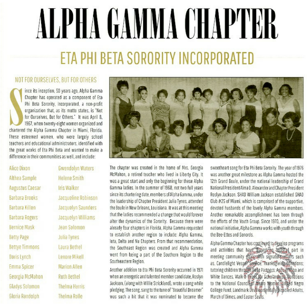 Since its inception, 50 years ago, Alpha Gamma Chapter has operated as a component of Eta Phi Beta Sorority, Incorporated, a non-profit organization that, as its motto states, is "Not for Ourselves, But for Others." It was April 8, 1967, when twenty-eight women organized and chartered the Alpha Gamma Chapter in Miami, Florida. These esteemed women, who were largely school teachers and educational administrators, identified with the great works of Eta Phi Beta and wanted to make a difference in their communities as well, and include:
