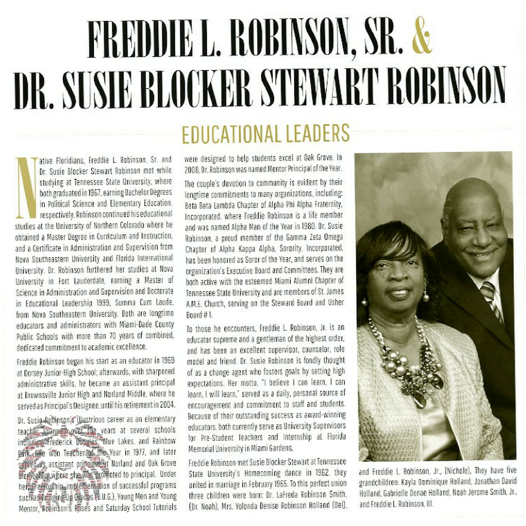 Native Floridians, Freddie L. Robinson, Sr. and Dr. Susie Blocker Stewart Robinson met while studying at Tennessee State University, where they both graduated in 1967,earningBachelorDegrees I in Political Science and Elementary Education, respectively. Robinson continued his educational studies at the University of Northern Colorado where he obtained a Master Degree in Curriculum and Instruction, and a Certificate in Administration and Supervision from Nova Southeastern University and Florida International University. Dr. Robinson furthered her studies at Nova University in Fort Lauderdale, earning a Master of Science in Administration and Supervision and Doctorate in Educational Leadership 1999, Summa Cum Laude, from Nova Southeastern University. Both are longtime educators and administrators with Miami-Dade County Public Schools with more than 70 years of combined, dedicated commitment to academic excellence. Freddie Robinson began his start as an educator in 1969 at Dorsey Junior-High School; afterwards, with sharpened administrative skills, he became an assistant principal at Brownsville Junior High and Norland Middle, where he served as Principal's Designee, until his retirement in 2004.