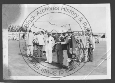 Several pressmen (Tropical dispatch, The Whip and Pittsburgh Courier) wait for the arrival of President Trumen in Miami, Miami, Florida. Unidentified photographer. Dan Francis Photograph Collection. | The Black Archives History & Research Foundation of South FL, Inc.