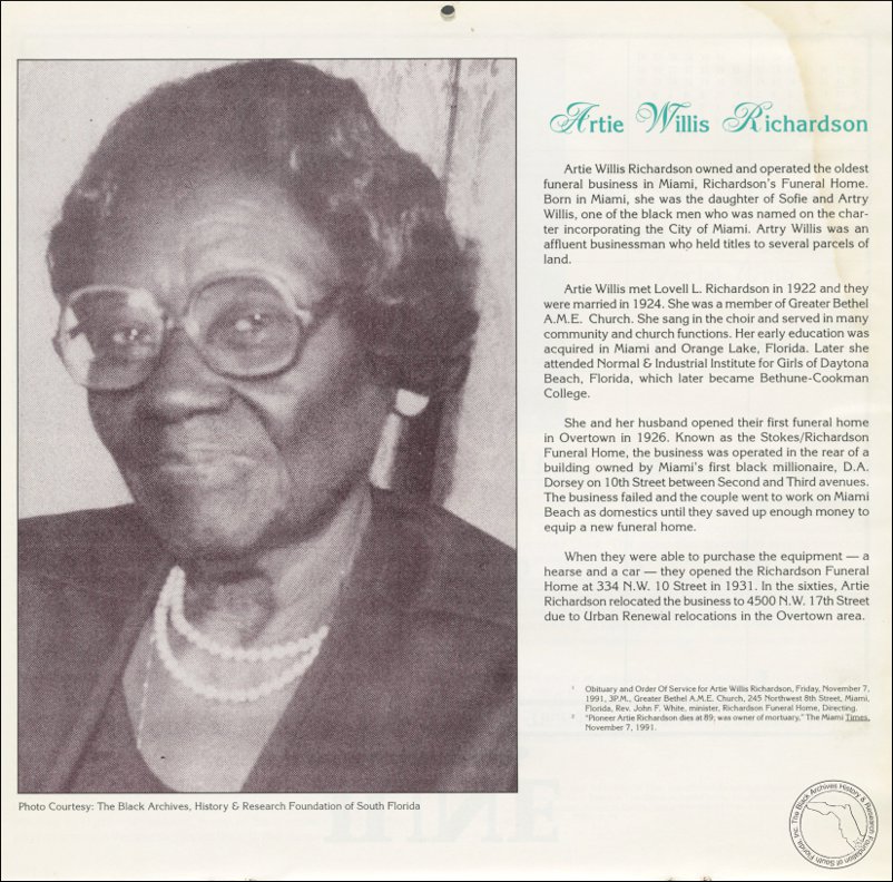 Artie Willis Richardson owned and operated the oldest funeral business in Miami, Richardson’s Funeral Home. Born in Miami, she was the daughter of Sofie and Artry Willis, one of the black men who were named on the charter incorporating the City of Miami. Artry Willis was an affluent businessman who held titles to several parcels of land.