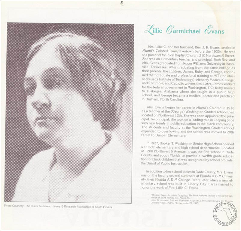 Evans, Lillie Carmichael. AT&T Miami-Dade County African-American History Calendar, 1996. | The Black Archives History & Research Foundation of South FL, Inc.