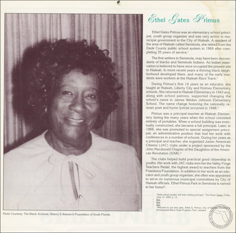 Ethel Gates Primus was an elementary school principal, youth group organizer and was very active in municipal government in the City of Hialeah. A resident of the area of Hialeah called Seminola, she retired from the Dade County Public School system in 1969 after completing 35 years of service.