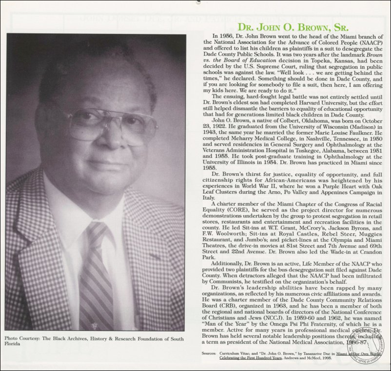 Sources: Curriculum Vitae; and “Dr. John O. Brown,” by Tananarive Due in Miami in Our Own Words: Celebrating the First Hundred Years, Andrews and McMeel, 1995.