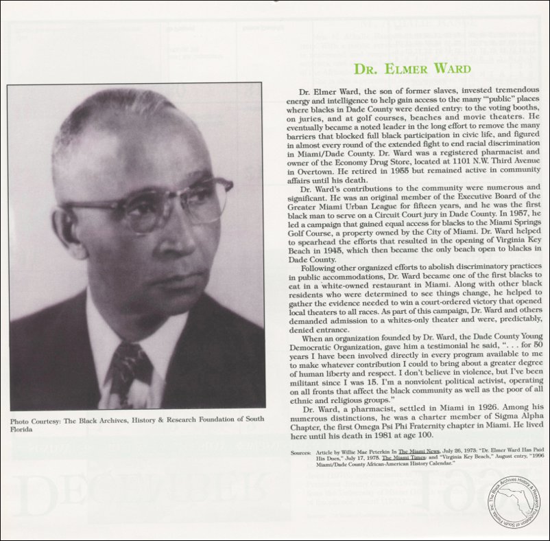 Sources: Article by Willie Mae Peterkin In The Miami News, July 26, 1973: “Dr. Elmer Ward Has paid His Dues,” July 17, 1975. The Miami Times: and “Virginia Key Beach,” August entry, “1996 Miami/Dade County African-American History Calendar.”