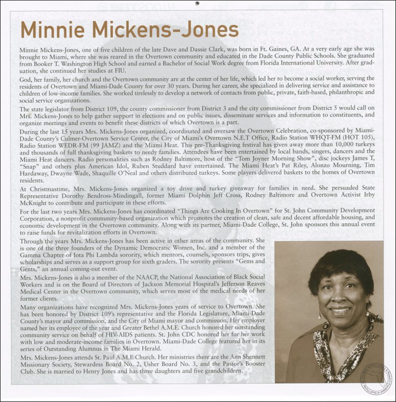 Mickens-Jones,Minnie. AT&T Miami-Dade County African-American History Calendar 2006/2007.