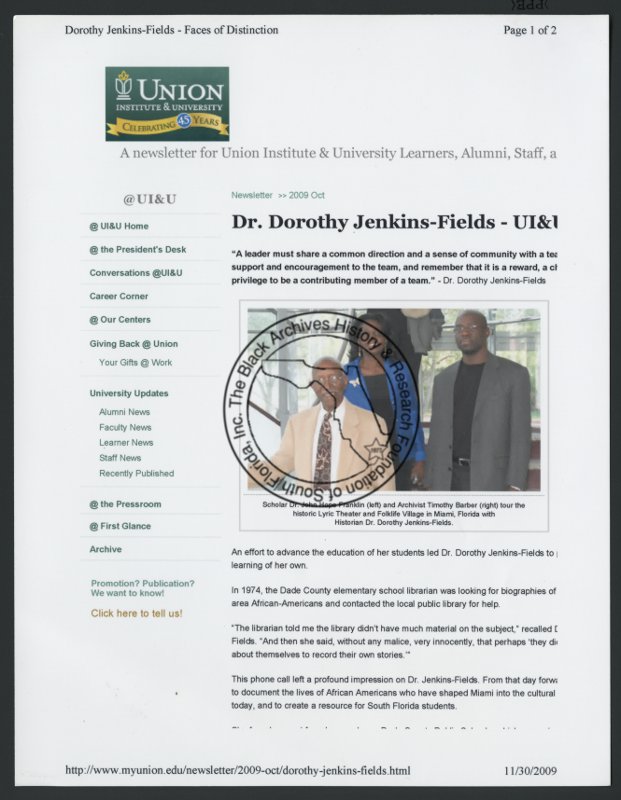 Dorothy Jenkins Fields: Faces of distinction (blog article), 2009. | The Black Archives History & Research Foundation of South FL, Inc.