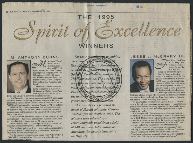Spirit of Excellence winners (newspaper articles), 1995. | The Black Archives History & Research Foundation of South FL, Inc.