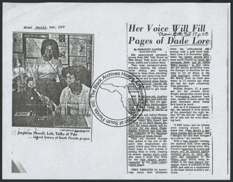 Her voice will fill pages of Dade lore (newspaper article), 1977. | The Black Archives History & Research Foundation of South FL, Inc.
