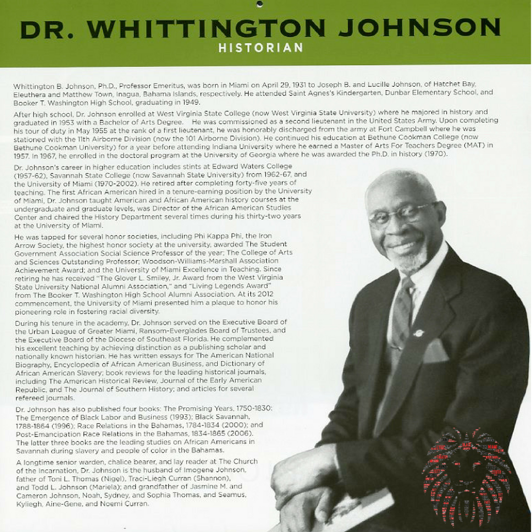 Whittington B. Johnson, Ph. D., Professor Emeritus, was born in Miami on April 29, 1931 to Joseph B. and Lucille Johnson, of Hatchet Bay, Eleuthera and Matthew Town, Inagua, Bahama Islands, respectively. He attended Saint Agnes’s Kindergarten, Dunbar Elementary School, and Booker T. Washington High School, graduating in 1949.