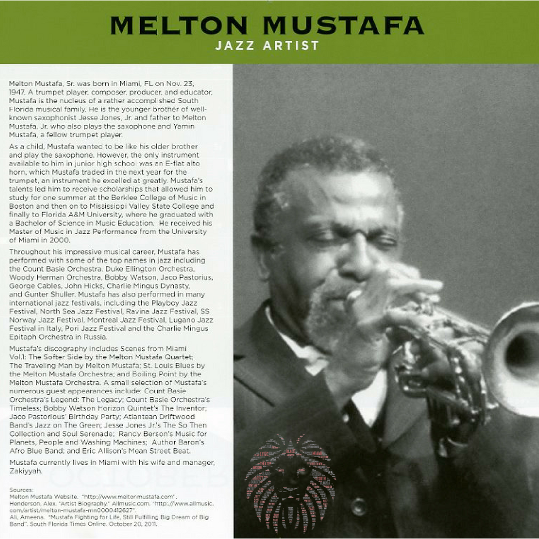 Melton Mustafa, Sr. was born in Miami, FL on Nov. 23, 1947. A trumpet player, composer, producer, and educator, Mustafa is the nucleus of a rather accomplished South Florida musical family. He is the younger brother of well-known saxophonist Jesse Jones, Jr. and father to Melton Mustafa, Jr. who also plays the saxophone and Yamin Mustafa, a fellow trumpet player.