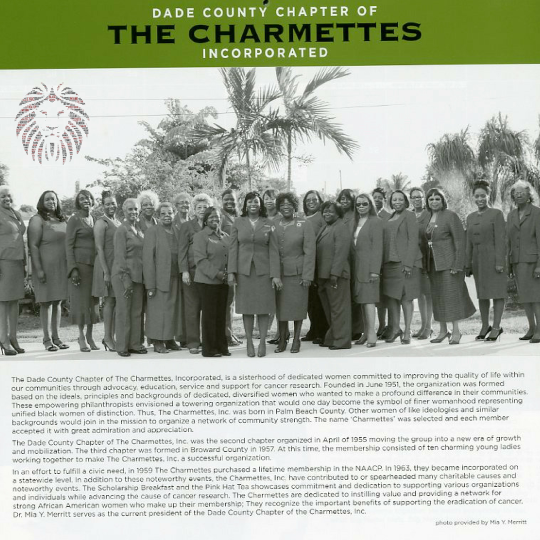 The Dade County Chapter of The Charmettes, Incorporated, is a sisterhood of dedicated women committed to improving the quality of life within our communities through advocacy, education, service and support for cancer research. Founded in June 1951, the organization was formed based on the ideals, principles and backgrounds of dedicated, diversified women who wanted to make a profound difference in their communities. These empowering philanthropists envisioned a towering organization that would one day become the symbol of finer womanhood representing unified black women of distinction. Thus, The Charmettes, Inc. was born in Palm Beach County. Other women of like ideologies and similar backgrounds would join in the mission to organize a network of community strength. The name 'Charmettes' was selected and each member accepted it with great admiration and appreciation.