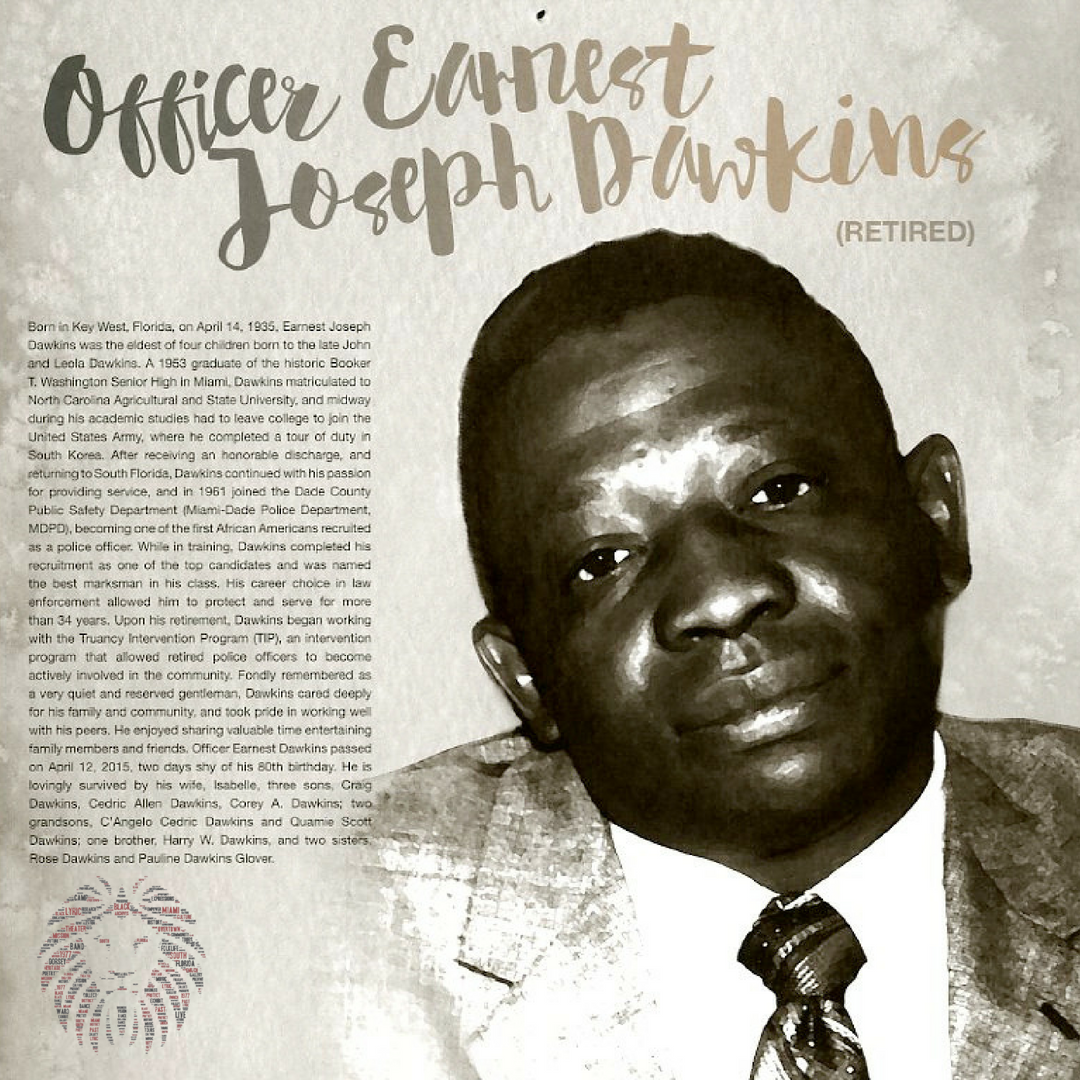 Born in Key West, Florida, on April 14, 1935, Earnest Joseph Dawkins was the eldest of four children born to the late John and Leola Dawkins. A 1953 graduate of the historic Booker T. Washington Senior High in Miami, Dawkins matriculated to North Carolina Agricultural and State University, and midway during his academic studies had to leave college to join the United States Army, where he completed a tour of duty in South Korea. After receiving an honorable discharge, and returning to South Florida, Dawkins continued with his passion for providing service, and in 1961 joined the Dade County Public Safety Department (Miami-Dade Police Department, MDPD), becoming one of the first African Americans recruited as a police officer. While in training, Dawkins completed his recruitment as one of the top candidates and was named the best marksman in his class. His career choice in law enforcement allowed him to protect and serve for more than 34 years. Upon his retirement, Dawkins began working with the Truancy Intervention Program (TIP), an intervention program that allowed retired police officers to become actively involved in the community. Fondly remembered as a very quiet and reserved gentleman, Dawkins cared deeply for his family and community, and took pride in working well with his peers. He enjoyed sharing valuable time entertaining family members and friends. Officer Earnest Dawkins passed on April 12, 2015, two days shy of his 80th birthday. He is lovingly survived by his wife, Isabelle, three sons, Craig Dawkins, Cedric Allen Dawkins, Corey A. Dawkins; two grandsons, C'Angelo Cedric Dawkins and Quamie Scott Dawkins; one brother, Harry W. Dawkins, and two sisters, Rose Dawkins and Pauline Dawkins Glover.