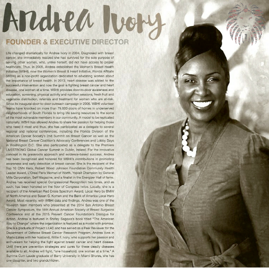 Life changed dramatically for Andrea Ivory in 2004. Diagnosed with breast cancer, she immediately realized she had survived for the sole purpose of serving other women, who, unlike herself, did not have access to proper healthcare. Thus, in 2005, Andrea established the Women's Breast Health Initiative (WBHI), now the Women's Breast & Heart Initiative, Florida Affiliate (WBHI) as a non-profit organization dedicated to educating women about the importance of breast health. In 2013, heart disease was added to the successful intervention and now the goal is fighting breast cancer and heart disease, one woman at a time. WBHI provides door-to-door awareness and education, screening, physical activity and nutrition sessions, fresh fruit and vegetable distribution, referrals and treatment for women who are at-risk. Since its inaugural door-to-door outreach campaign in 2006, WBHI volunteer teams have knocked on more than 79,000 doors of homes in underserved neighborhoods of South Florida to bring life saving resources to the some of the most vulnerable members in our community. A model to be replicated nationally, WBHI has allowed Andrea to share her passion for helping those who need it most and thus, she has participated as a delegate to several regional and national conferences, including the Florida Division of the American Cancer Society's 2nd Summit on Breast Cancer as well as the National Breast Cancer Coalition's Advocacy Conferences and Lobby Days in Washington D.C. She also participated as a delegate to the Premiere LIVESTRONG Global Cancer Summit in Dublin, Ireland.