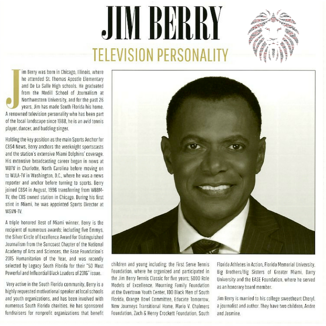 Holding the key position as the main Sports Anchor for CBS4 News, Berry anchors the weeknight sportscasts and the station's extensive Miami Dolphins' coverage. His extensive broadcasting career began in news at WBTV in Charlotte, North Carolina before moving on to WJLA-TV in Washington, D.C., where he was a news reporter and anchor before turning to sports. Berry joined CBS4 in August, 1996 transferring from WBBM-TV, the CBS owned station in Chicago. During his first stint in Miami, he was appointed Sports Director at WSVN-TV. A triple honored Best of Miami winner, Berry is the recipient of numerous awards; including five Emmys, the Silver Circle of Excellence Award for Distinguished Journalism from the Suncoast Chapter of the National Academy of Arts and Sciences, the Ease Foundation's 2015 Humanitarian of the Year, and was recently selected by Legacy South Florida for their "50 Most Powerful and Influential Black Leaders of 2016" issue. Very active in the South Florida community, Berry is a highly requested motivational speaker at local schools and youth organizations, and has been involved with numerous South Florida charities. He has sponsored fundraisers for nonprofit organizations that benefit children and young including: the First Serve Tennis Foundation, where he organized and participated in the Jim Berry Tennis Classic for five years; 5000 Role Models of Excellence, Mourning Family Foundation at the Overtown Youth Center, 100 Black Men of South Florida, Orange Bowl Committee, Educate Tomorrow, New Journeys Transitional Home, Mario V. Chalmers Foundation, Zach & Henry Crockett Foundation, South Florida Athletes in Action, Florida Memorial University, Big Brothers/Big Sisters of Greater Miami, Barry University and the EASE Foundation, where he served as an honorary board member.