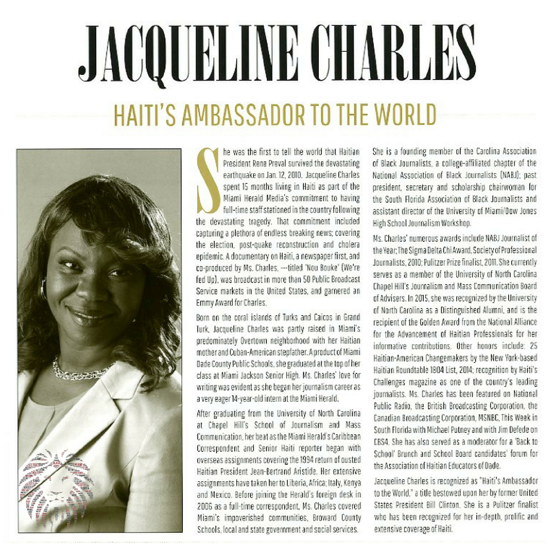 Jacqueline Charles is recognized as "Haiti's Ambassador to the World," a title bestowed upon her by former United States President Bill Clinton. She is a Pulitzer finalist who has been recognized for her in-depth, prolific and extensive coverage of Haiti.