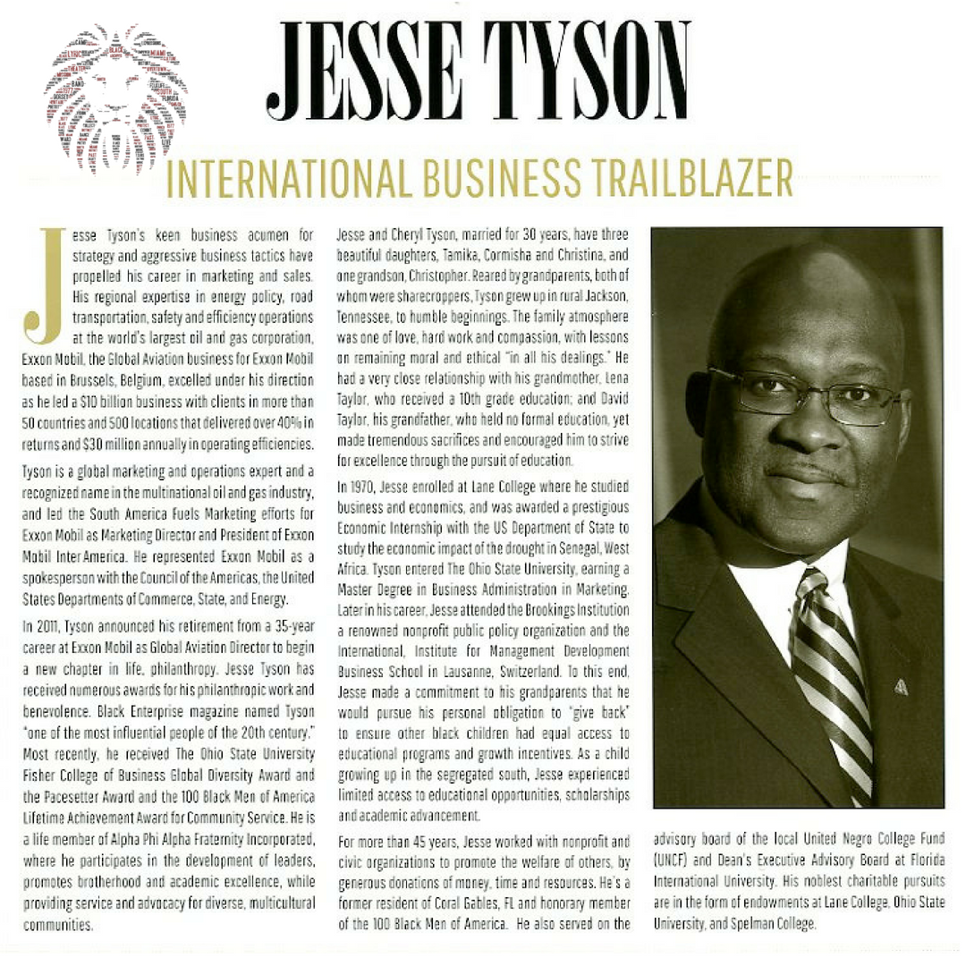 Jesse Tyson's keen business acumen for strategy and aggressive business tactics have propelled his career in marketing and sales. His regional expertise in energy policy, road transportation, safety and efficiency operations at the world's largest oil and gas corporation, Exxon Mobil, the Global Aviation business for Exxon Mobil based in Brussels, Belgium, excelled under his direction as he led a $10 billion business with clients in more than 50 countries and 500 locations that delivered over 40% in returns and $30 million annually in operating efficiencies. Tyson is a global marketing and operations expert and a recognized name in the multinational oil and gas industry, and led the South America Fuels Marketing efforts for Exxon Mobil as Marketing Director and President of Exxon Mobil Inter America. He represented Exxon Mobil as a spokesperson with the Council of the Americas, the United States Departments of Commerce, State, and Energy. In 2011, Tyson announced his retirement from a 35-year career at Exxon Mobil as Global Aviation Director to begin a new chapter in life, philanthropy. Jesse Tyson has received numerous awards for his philanthropic work and benevolence. Black Enterprise magazine named Tyson "one of the most influential people of the 20th century."